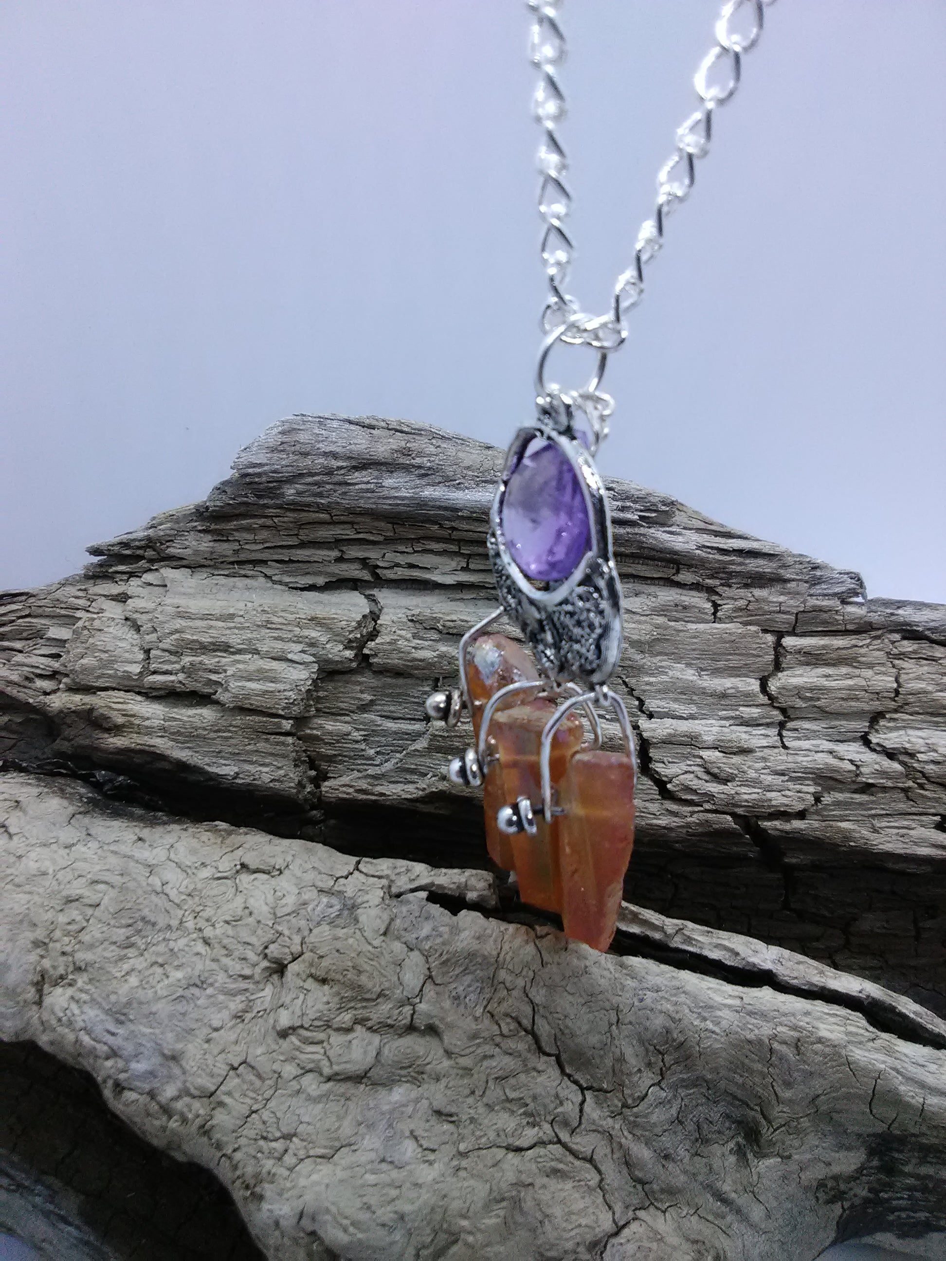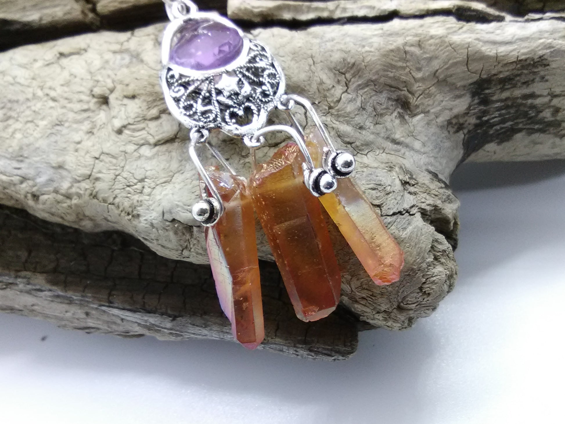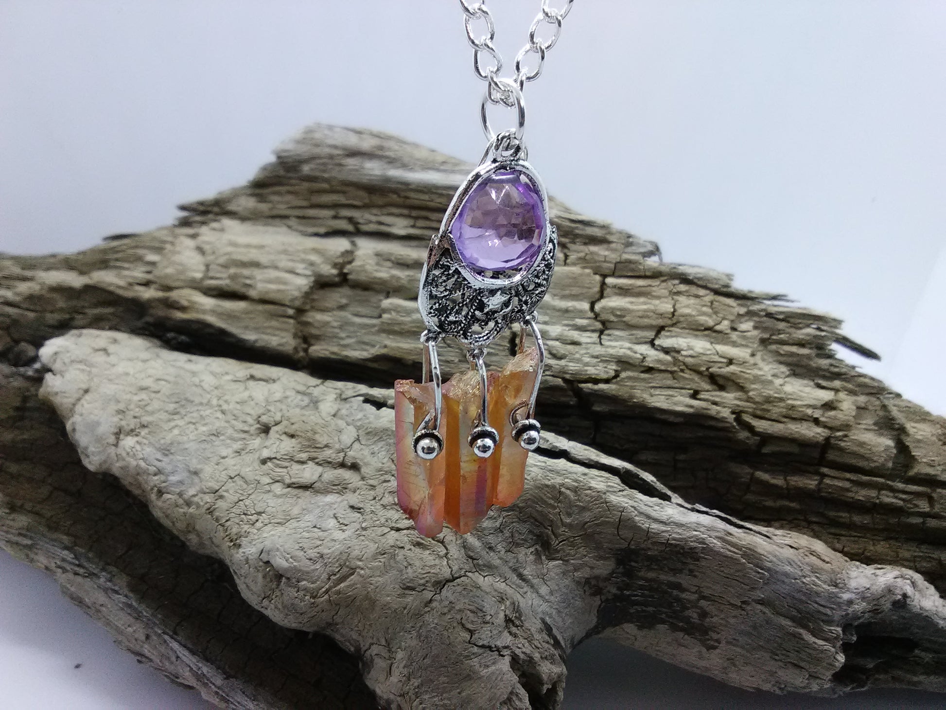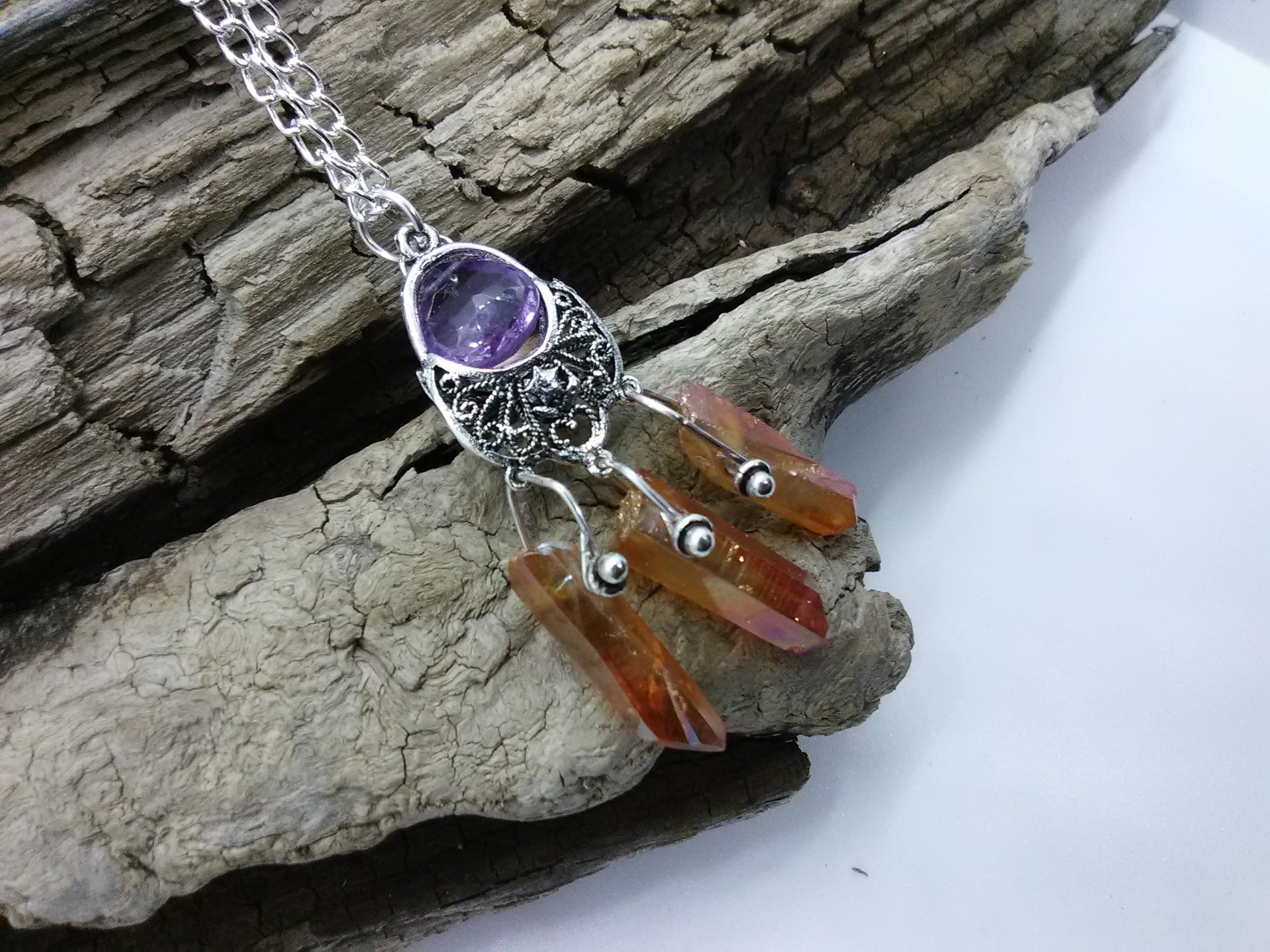 Ingredients: Three quartz crystals, a faceted ametrine soft purple stone. Ametrine is a naturally occurring combination of amethyst and citrine. This necklace is 24” with an extra 2” for the pendant and it has a magnetic clasp.