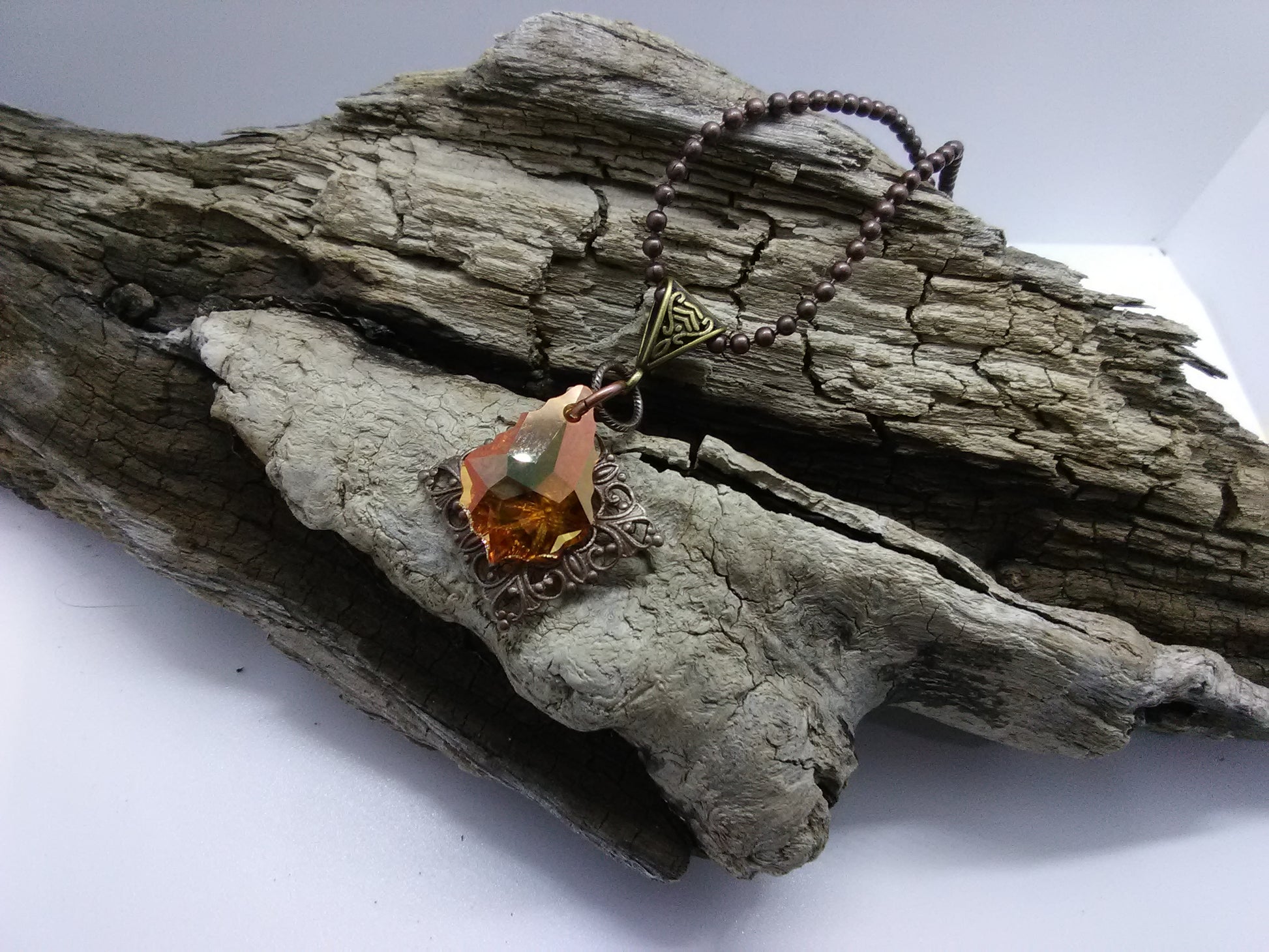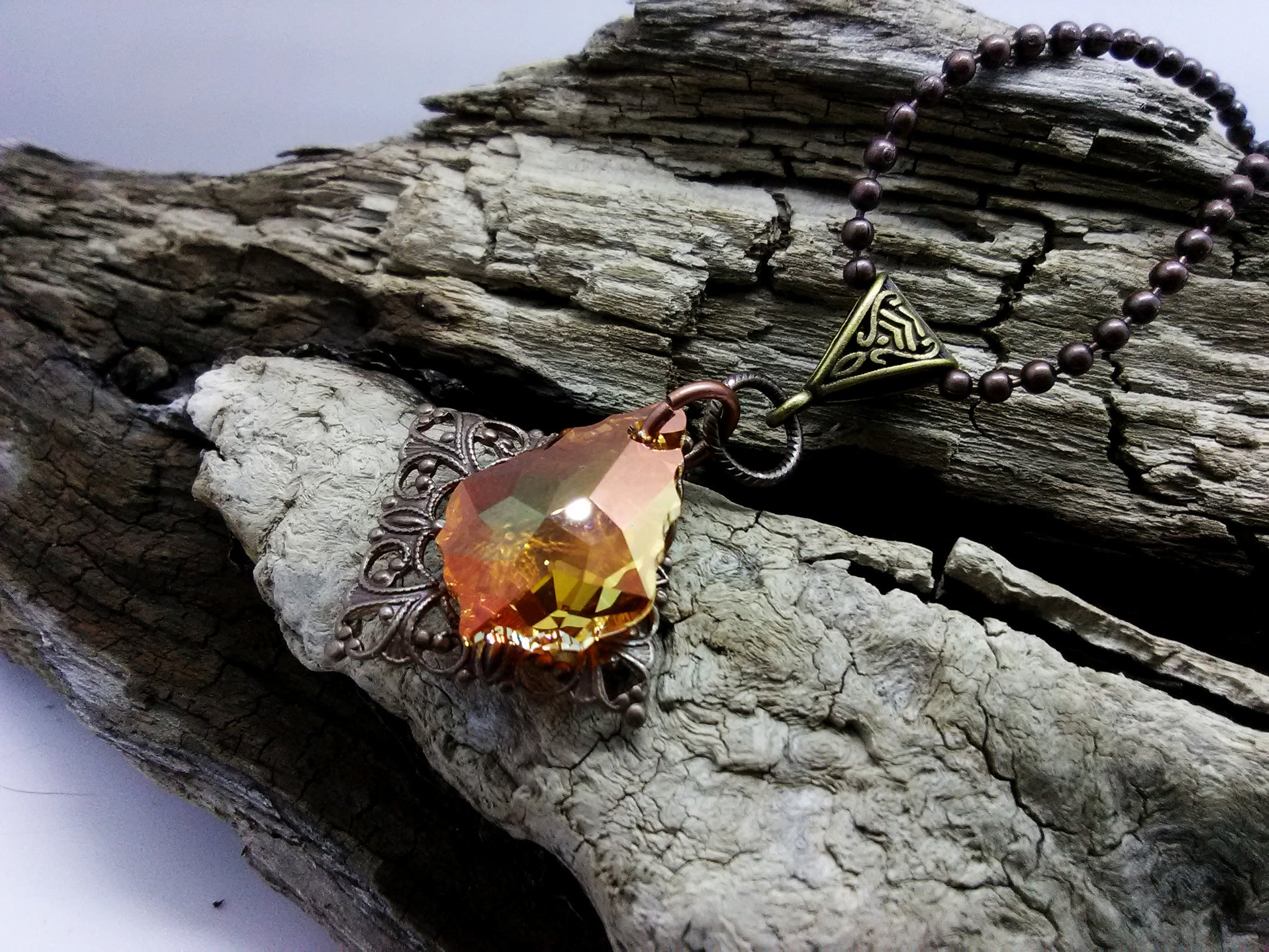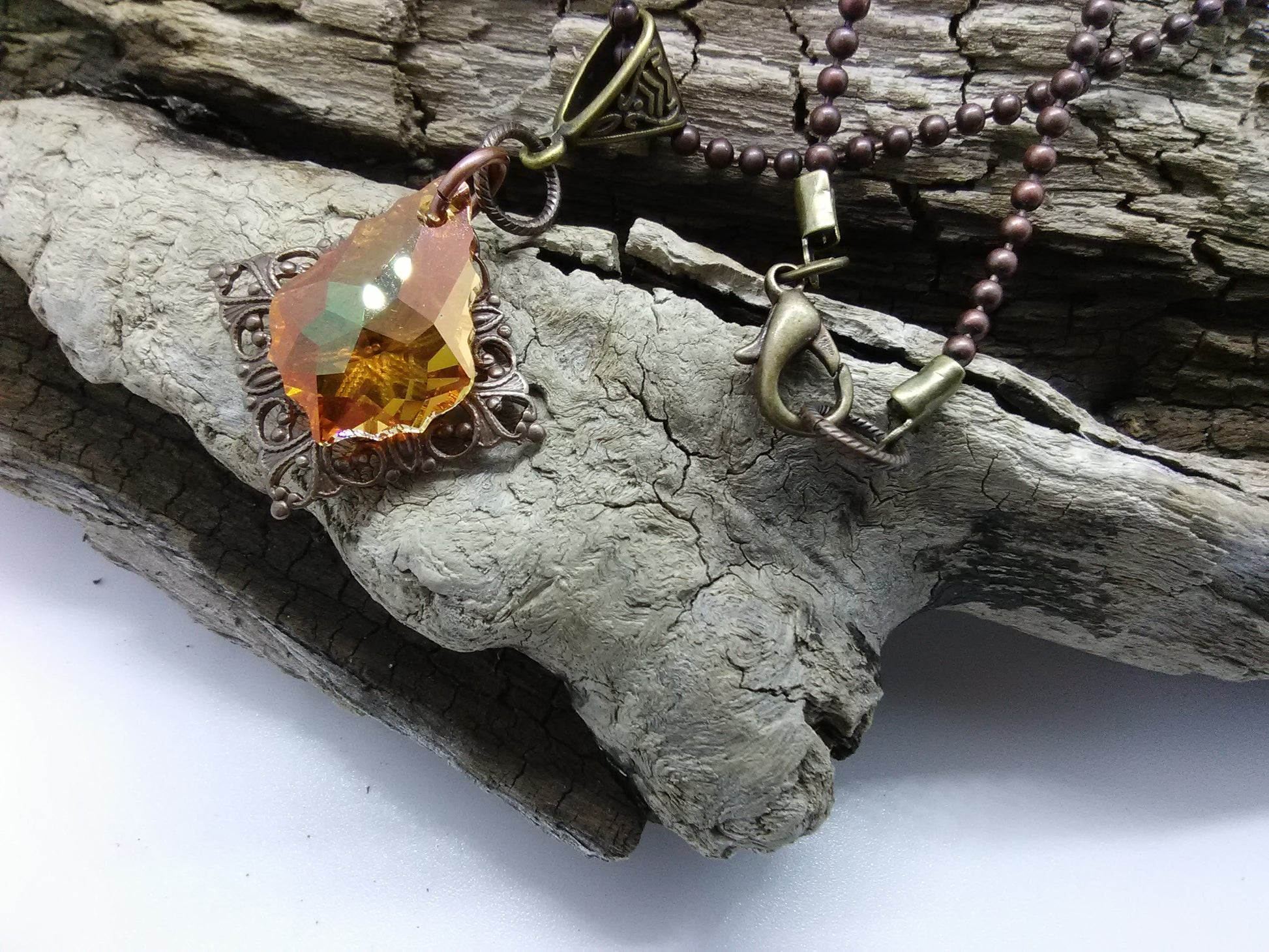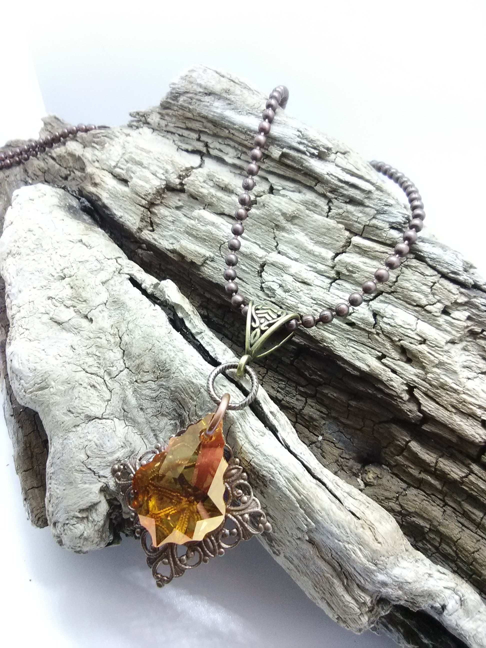 Crystal Honey Necklace. This piece has a very sparkly Swarovski Crystal set against a piece of filigree brass. 18-1/2” long, lobster claw clasp.