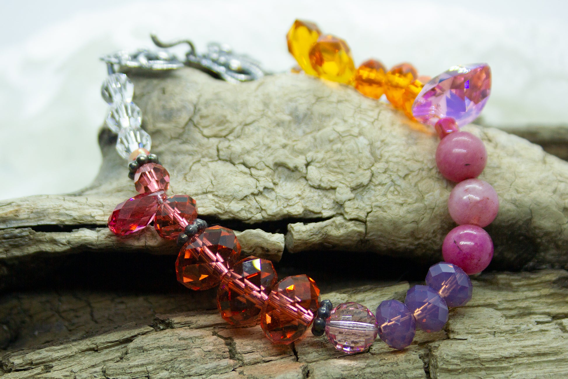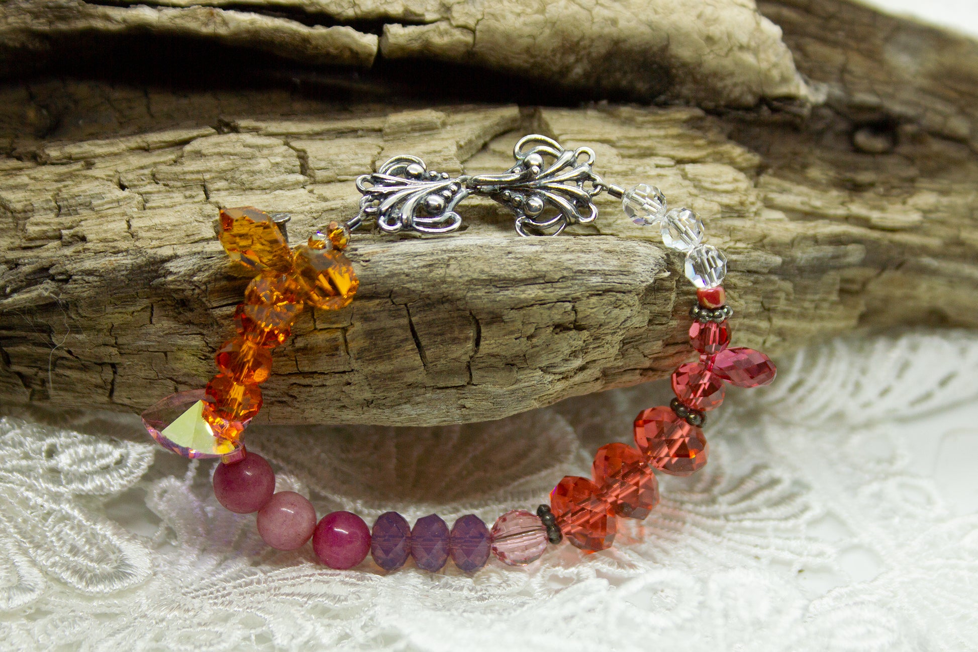Made of many Swarovski crystals (including one heart crystal), quartz beads, a few sterling beads, and a sterling clasp. Measures: 7.5"