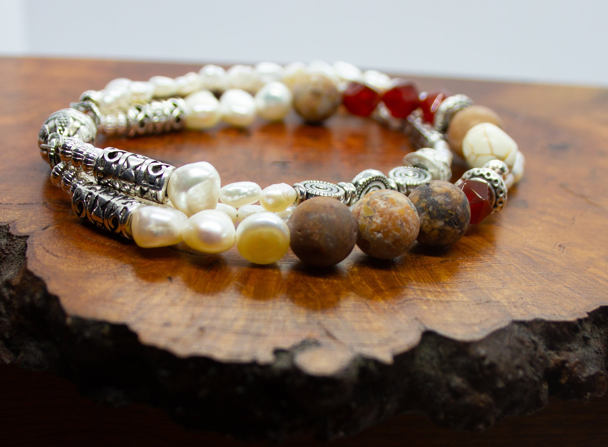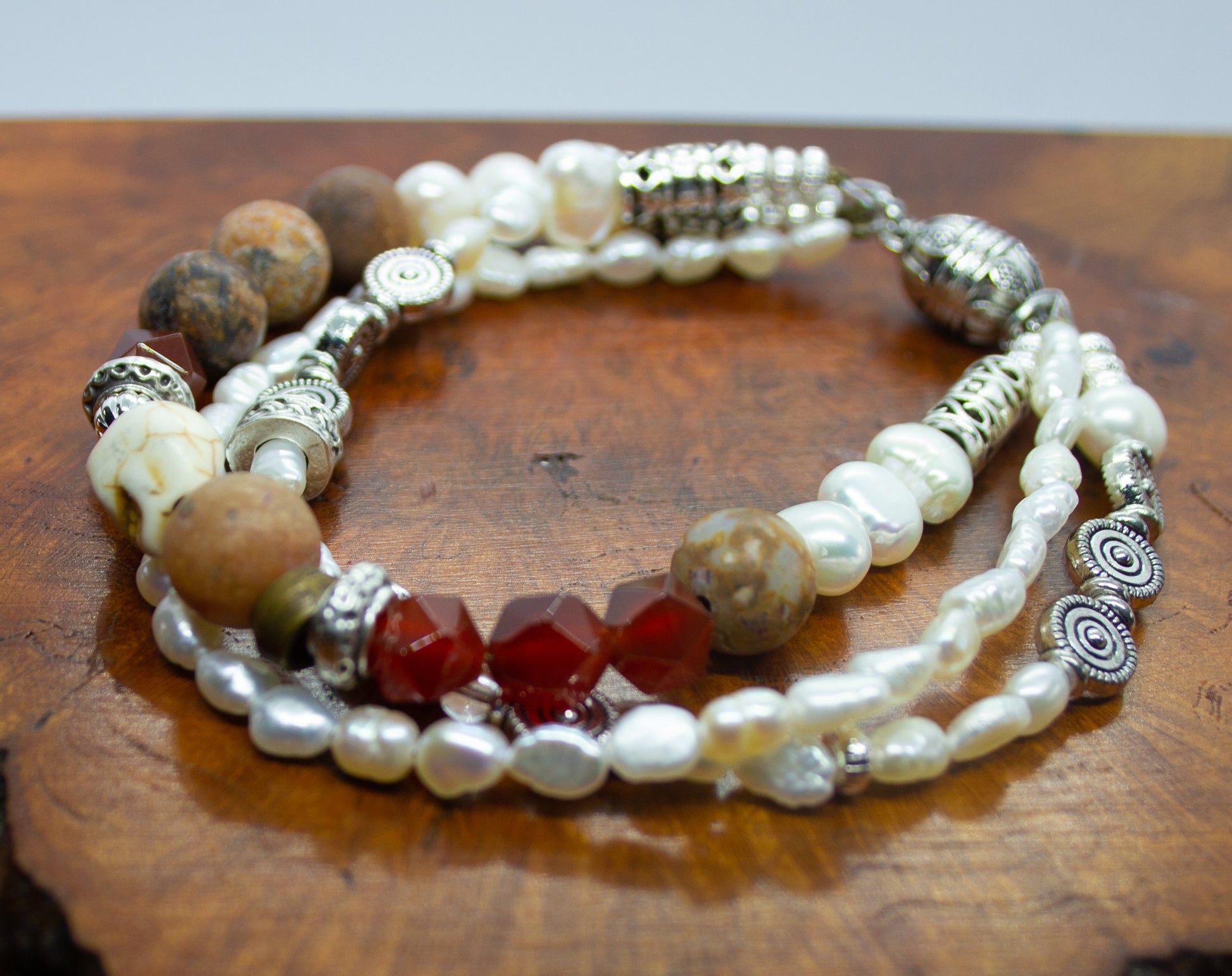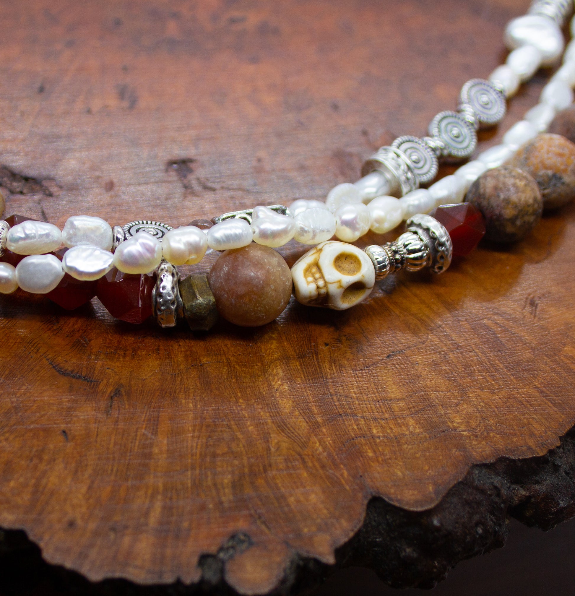Have another skull: Three strands of fun. Freshwater pearls, Bali silver, Stone, Madagascar Carnelian. Magnetic clasp, 8.5 inches long