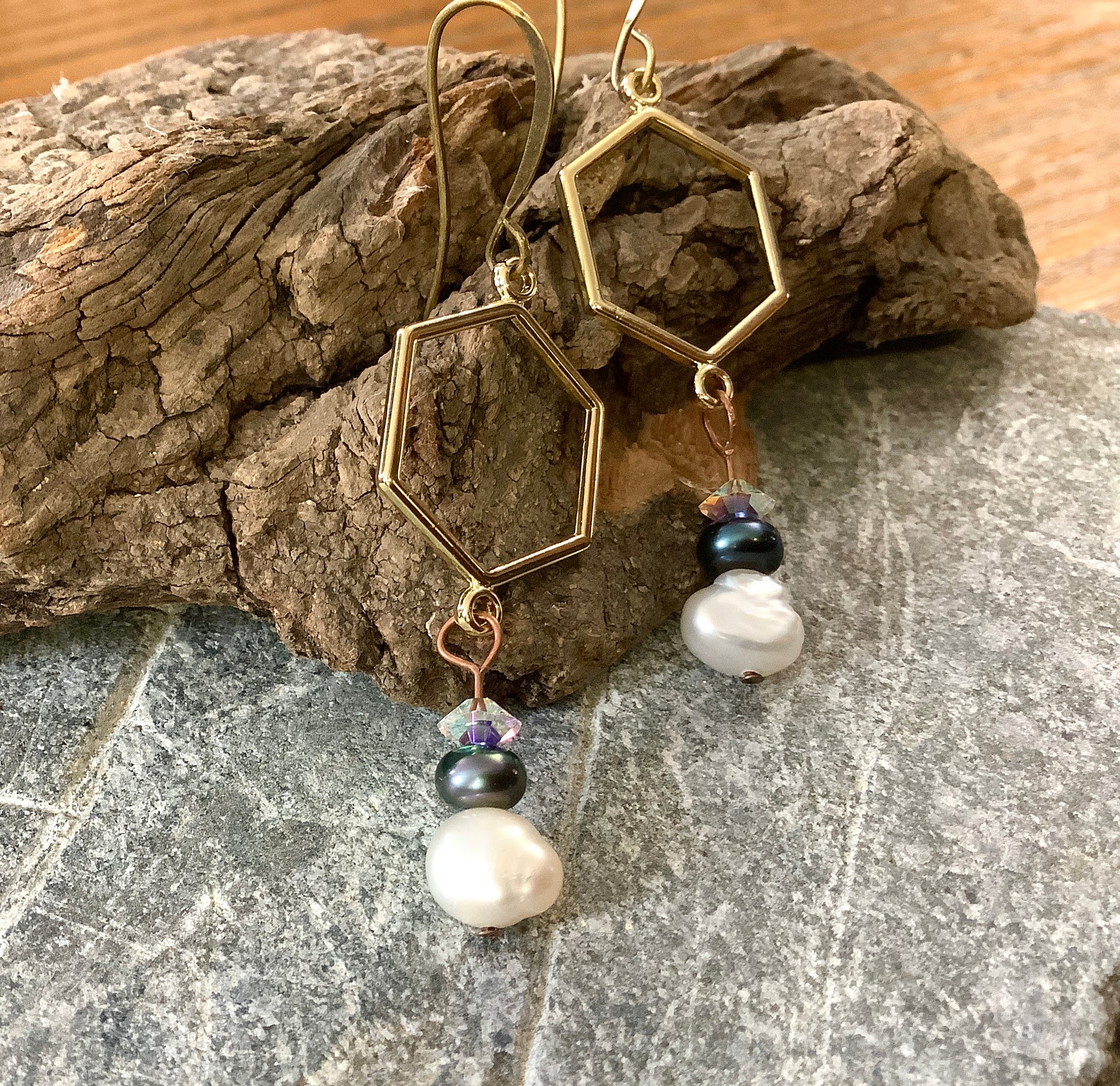 A pair of earrings with bright brass hexagons, burnished brass ear wires, delicate white freshwater pearls, dark gray freshwater pearls, and Swarovski crystals.