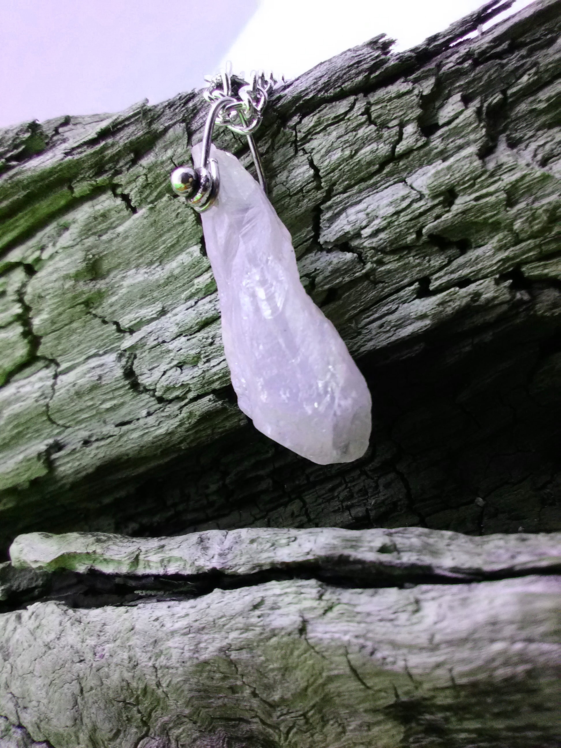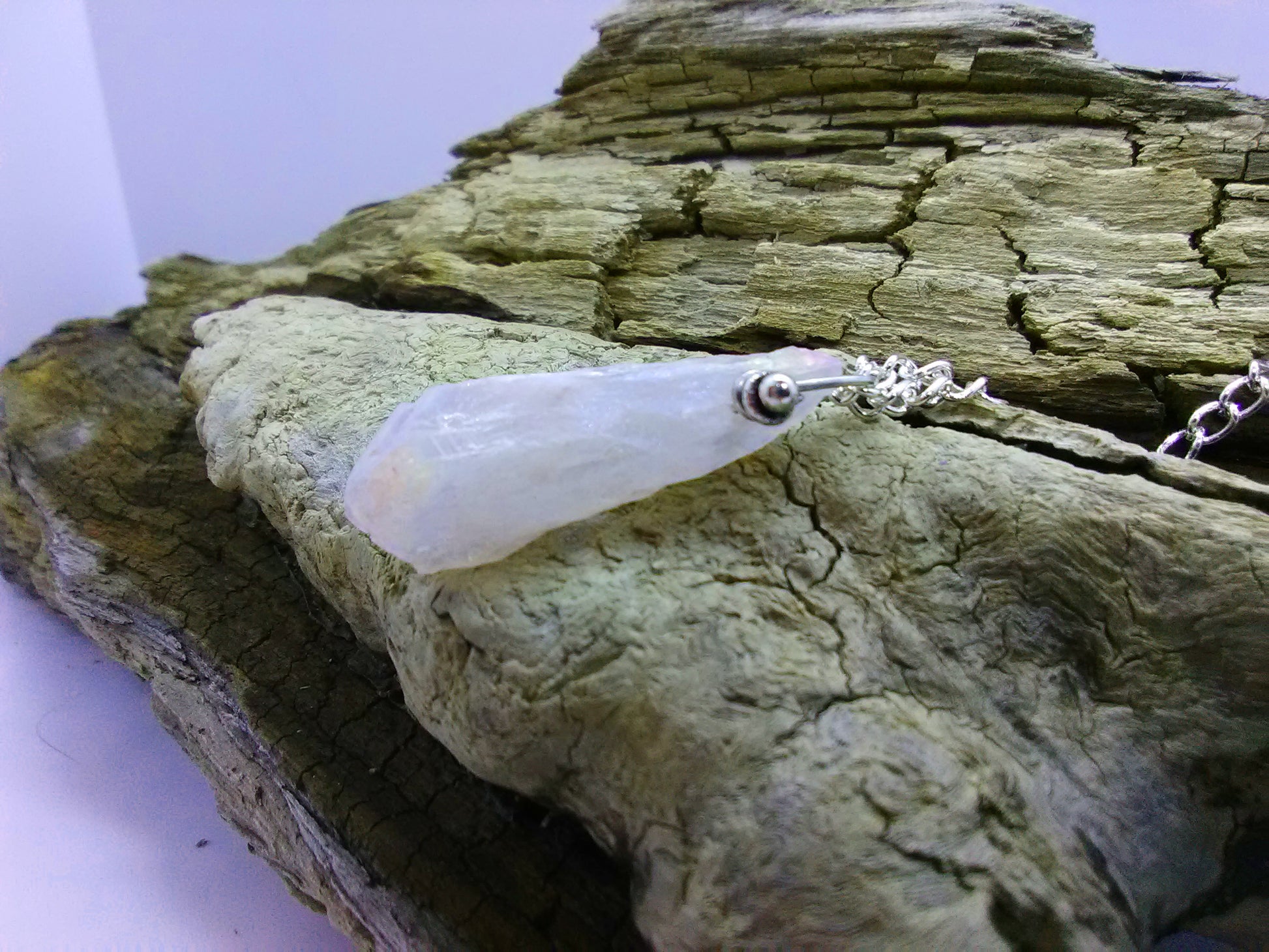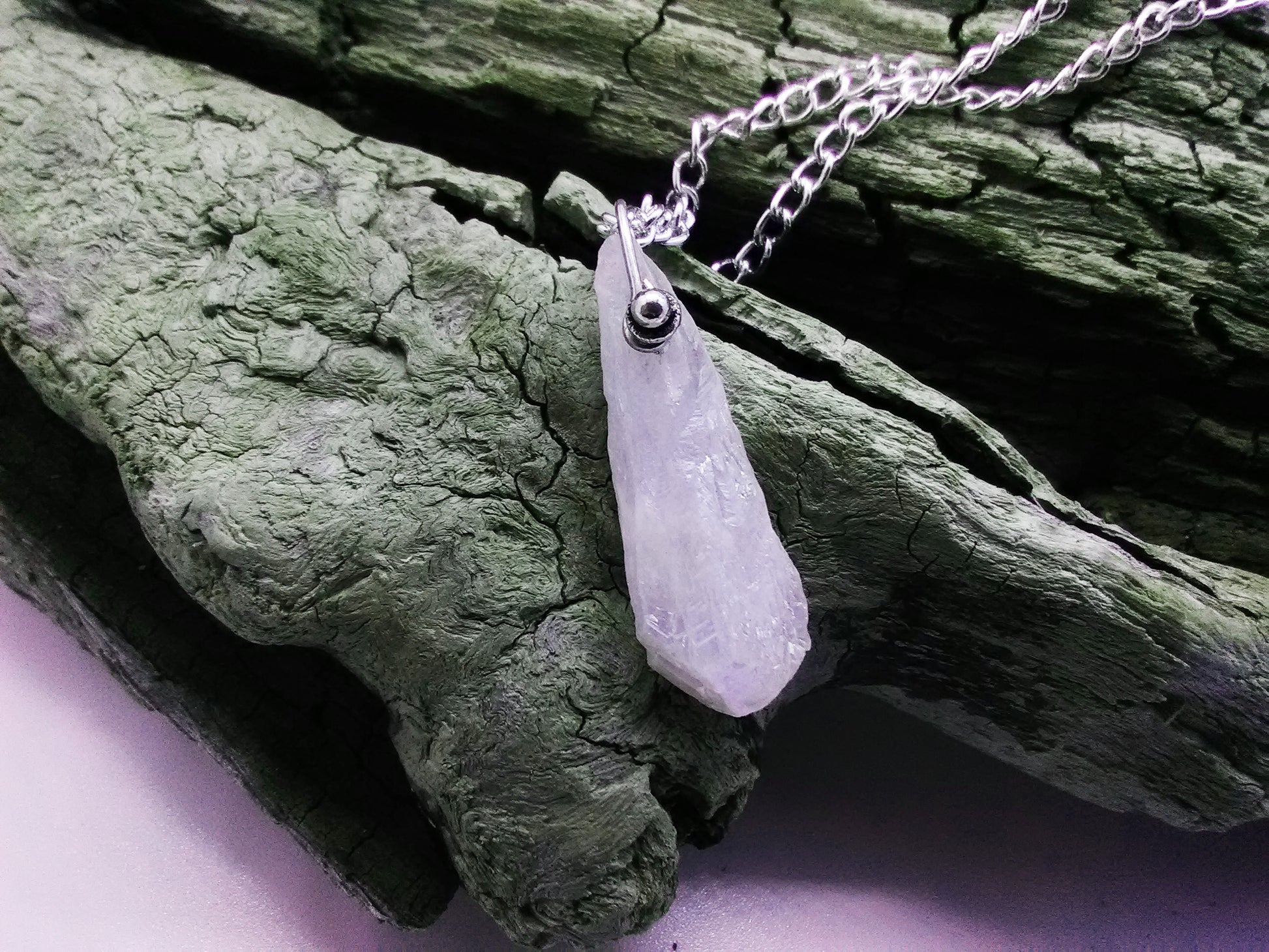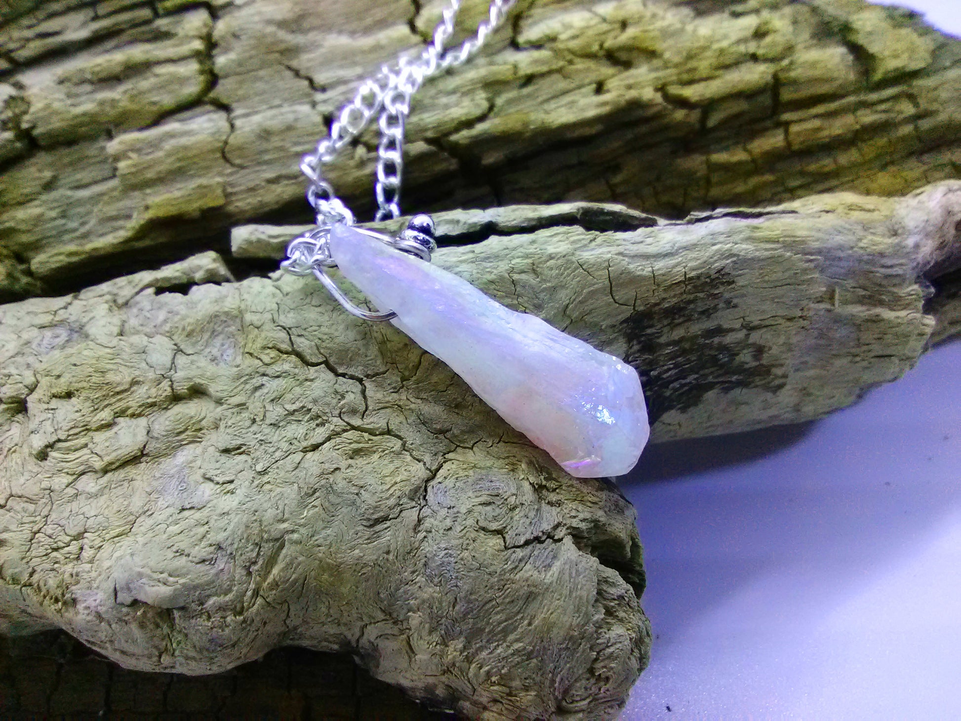 Pink Frosting Necklace. This piece has a very light pink quartz crystal and measures 24” (pendant adds 1-1/4”), and has a toggle clasp (see photo).