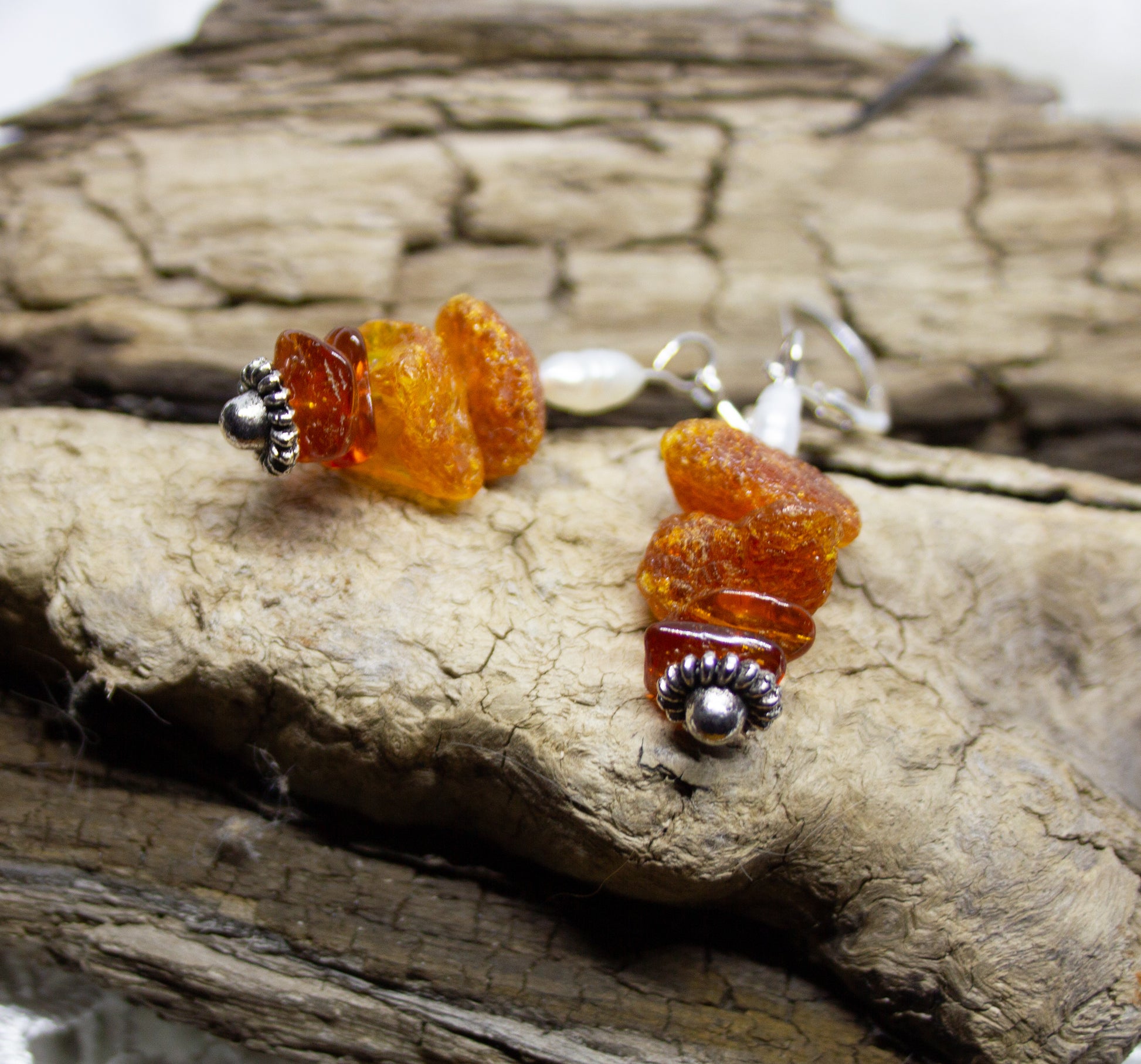 Sea Goddess Tears: Baltic Amber, freshwater pearls, lever-back earwires, 2.5 inches long.