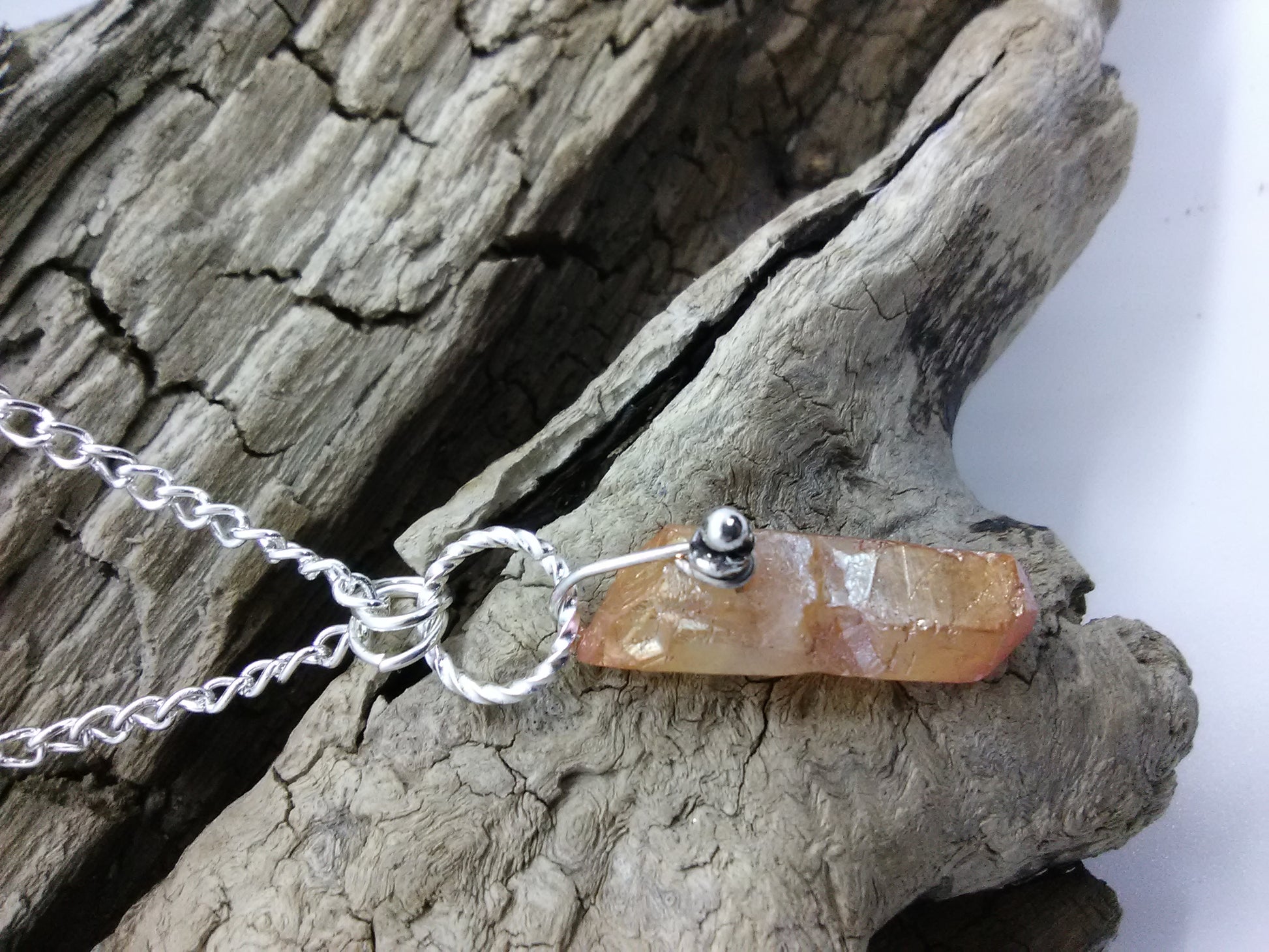 Sweet Honey. A single honey-colored quartz crystal placed delicately upon a silver-colored chain. Chain is 24”.